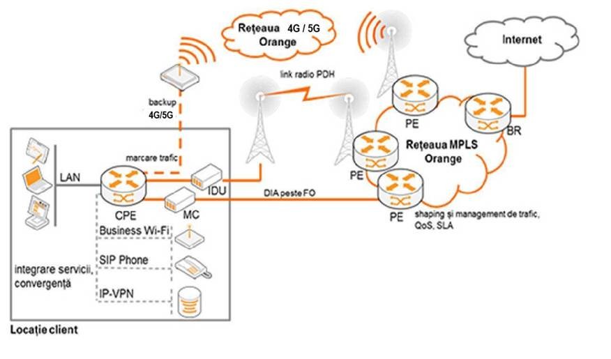 Asigură conexiunea dintre router și rețeaua Orange. În funcție de condițiile locale, se poate realiza prin fibră optică sau buclă locală radio.