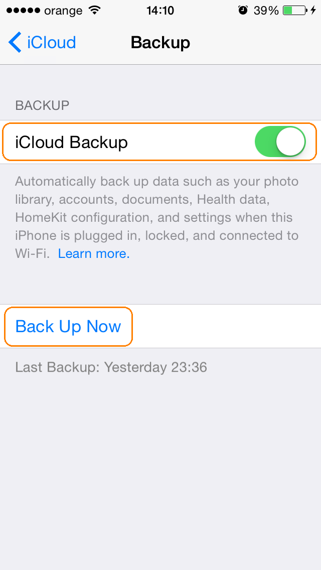 d. bifeaza functia de iCloud Backup si apasa butonul Back up Now.