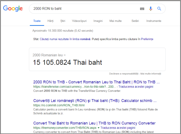 Să spunem că vrei să pleci în vacanță în Thailanda și ai vrea să știi cam cât valorează suma în RON pe care o ai tu, în moneda Thailandeză - baht. Pentru asta este suficient să folosești comanda ”x RON to baht” , așa cum se poate vedea în imaginea de mai jos: