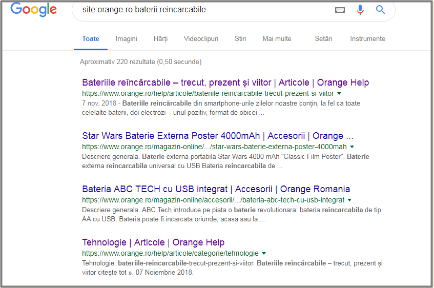 De exemplu, dacă aș vrea să găsesc articolul despre bateriile reîncărcabile pe care l-am citit pe orange.ro, voi folosi sintagma “site:orange.ro baterii reincarcabile”