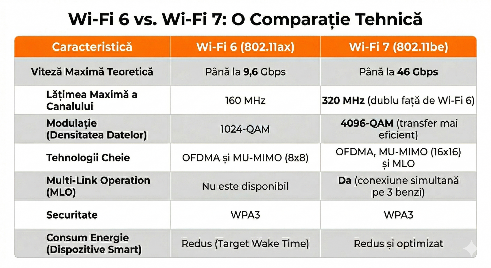 Notă: înaite de a lua o decizie, asigură-te că dispozitivele tale sunt compatibile cu această tehnologie; verifică specificațiile dispozitivului (căută 802.11ax sau WiFi 6).