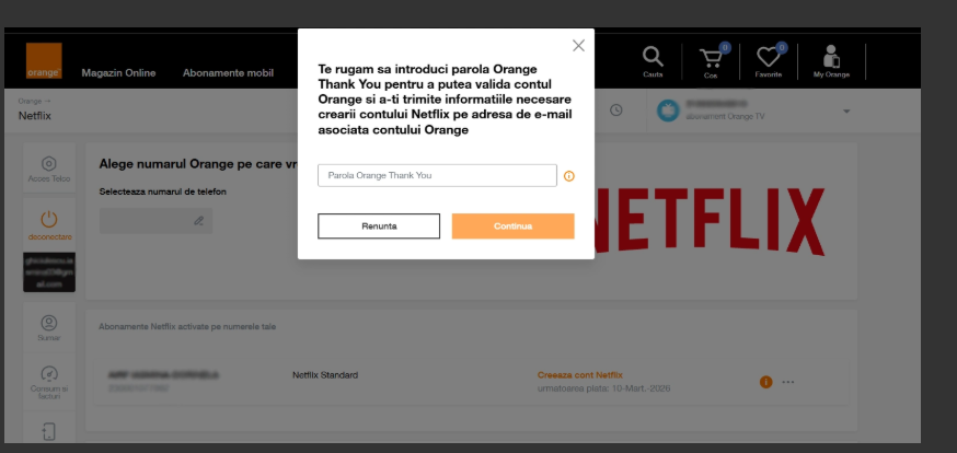 Dacă nu ai niciun abonament de voce mobilă activat pe acelasi cod de client pe care ai activat pachetul eligibil de Netflix 3 luni cadou, trebuie să validezi parola Orange si vei primi un email cu detaliile pentru crearea contului pe adresa de email asociată contului My Orange. Parola inițială Orange, dacă nu ai personalizat-o deja, este formată din ultimele 6 cifre din CNP-ul cărții de indentitate a titularului de abonament.