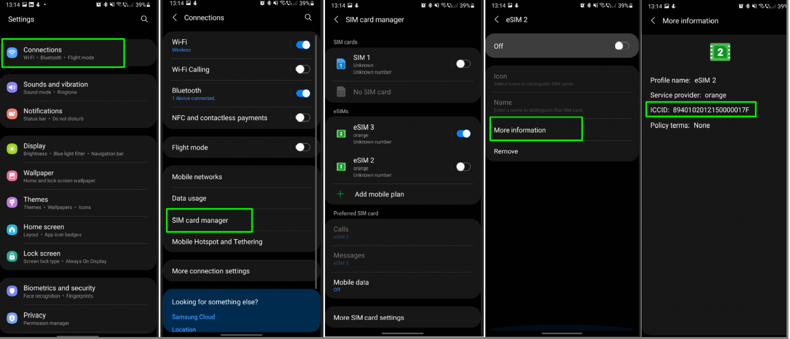 Accesează Settings ►Connections ► SIM card manager și în secțiunea eSIMs poți vedea toate porfilele de eSIM instalate pe telefonul tău. Selectează-l pe unul dintre ele și alege More Information. Seria completă a profilului tău de eSIM este compusă din cifrele afișate în câmpul ICCID (dacă ai nevoie de o schimbare de SIM/eSIM și ți se solicită seria eSIM-ului, este important să știi că trebuie să folosești doar primele 12 cifre ale seriei, fără litera F de la final, dacă ea există).