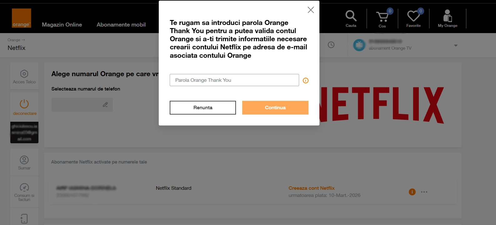 Dacă nu ai niciun abonament de voce mobilă activat pe acelasi cod de client pe care ai activat pachetul eligibil de Netflix 3 luni cadou, trebuie să validezi parola Orange si vei primi un email cu detaliile pentru crearea contului pe adresa de email asociată contului My Orange. Parola inițială Orange, dacă nu ai personalizat-o deja, este formată din ultimele 6 cifre din CNP-ul cărții de indentitate a titularului de abonament.